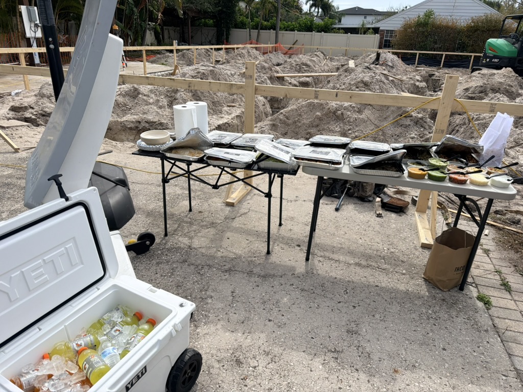 Last week we brought in a taco bar from Taco Dirty for lunch. There were about fifteen workers on site that day. When the food arrived, the guy in charge waved everyone over and they dropped their tools where they were and came running.